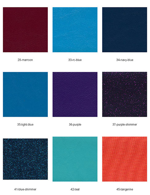 These are our current standard piping color choices for all of our seats. When making an inquiry or order through one of our dealers, please not the number under each of the examples, for example 7-light-grey. Examples of our "exotic" fabrics can be found here. You may also download an Adobe Acrobat PDF of the piping choices we offer by clicking here.